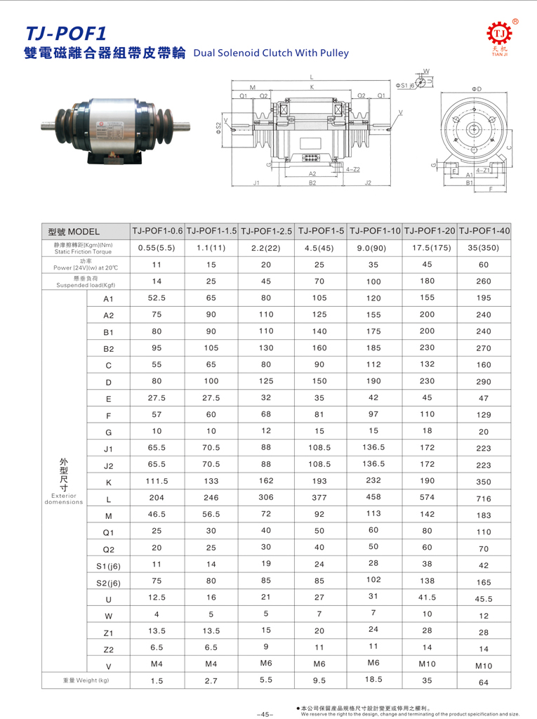 天機傳動雙電磁離合器正反轉專用TJ-POF1型附雙皮帶輪,或稱之為雙重電磁離合器組,由兩個TJ-A型摩擦式電磁離合器組成。獨特設計的組合,摩擦部不易磨耗,動作精確、轉動部分慣性小。其工作原理與TJ-POF2型雙電磁離合組一樣,該型雙電磁離合器組合適,常規扭矩 6Nm~400Nm。