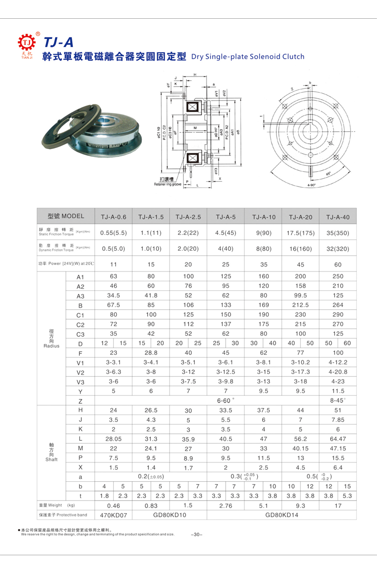 天機傳動干式電磁離合器由銜鐵(電樞板)、定子、轉子、板型彈簧片、磁性線圈、來令片、軸承等元件構成,統一使用DC24V,標準規格0.6-40KG。